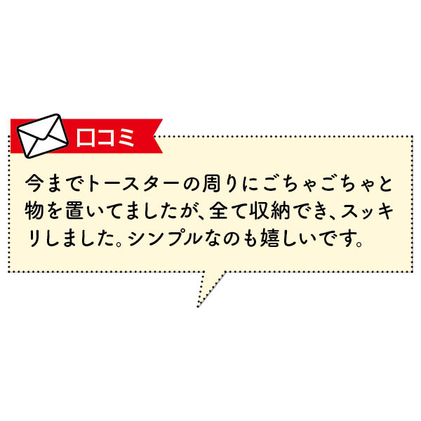 トースターの周りにあったお菓子やパンが収納でき、スッキリして嬉しく思います。